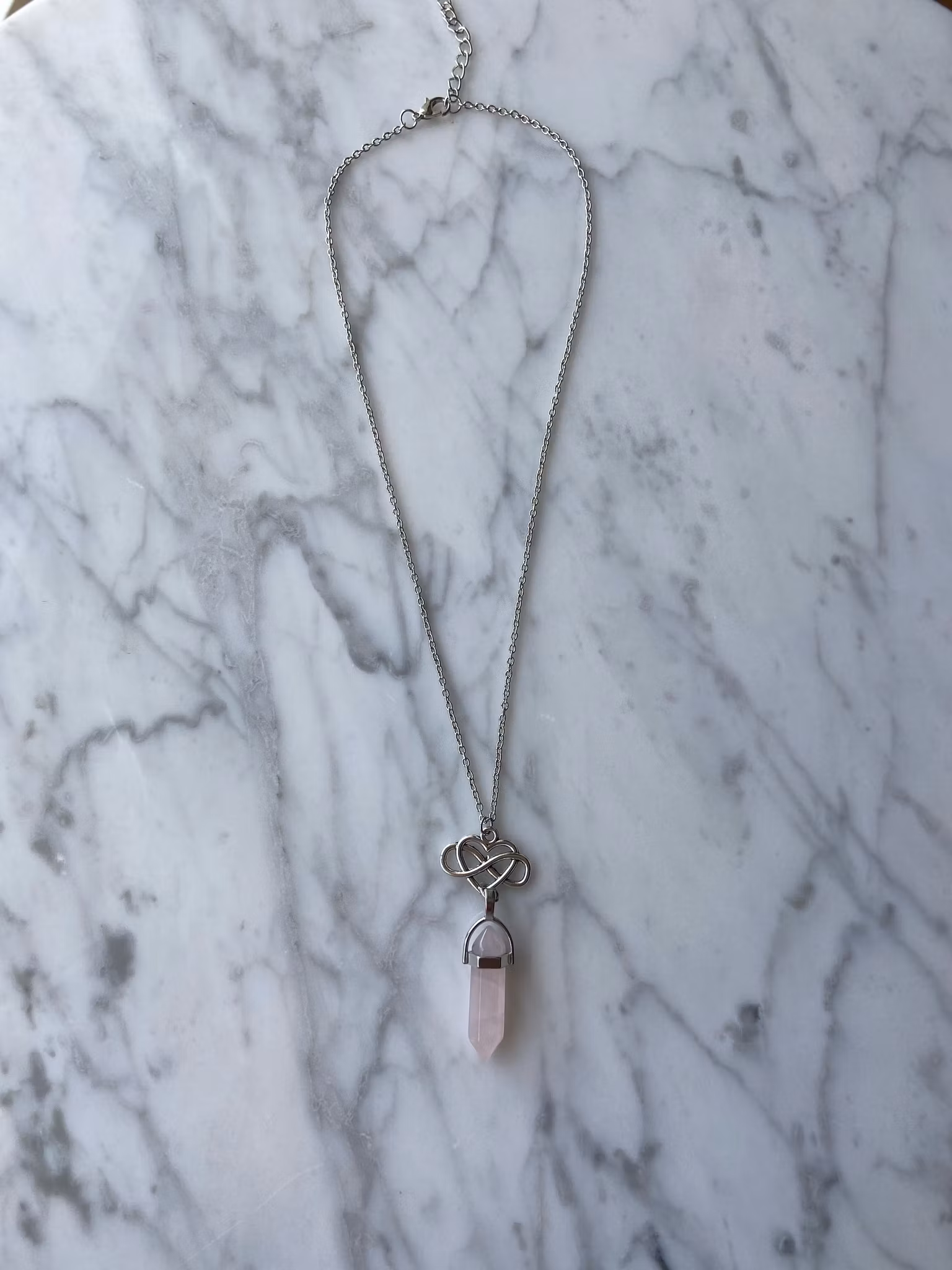 Hängssmycke med Infintyheart och rosenkvarts-spets. Ett smycke som skänker bäraren kärleksfulla energier - rosenkvarts representerar all sorts kärlek och balanserar energierna hos bäraren.